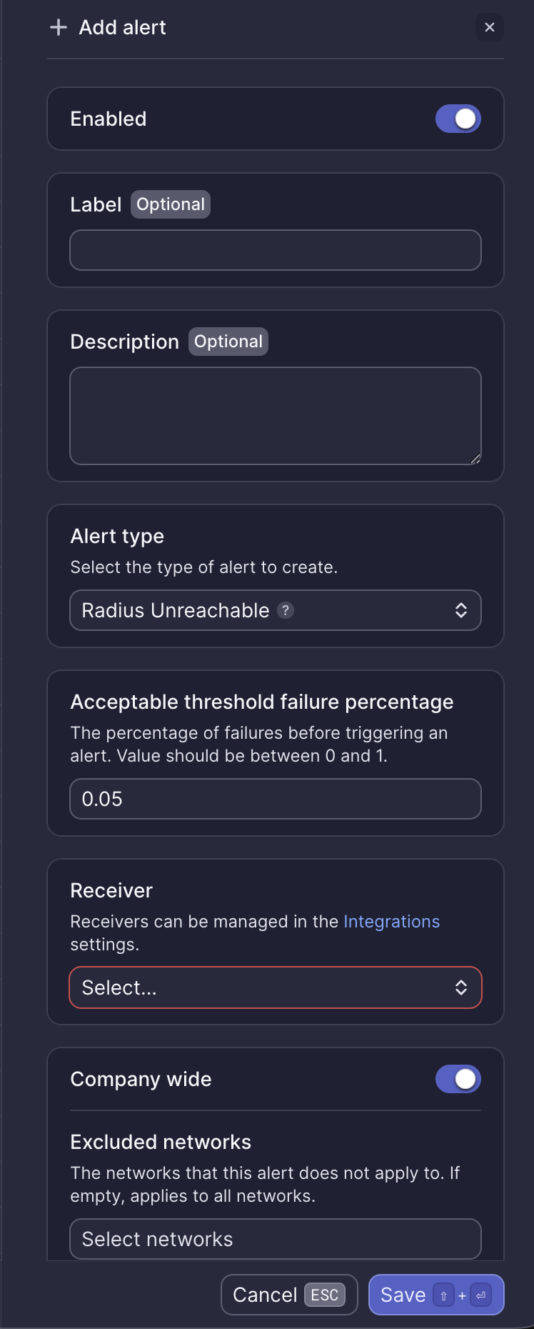 This alert corresponds to the ALERT_RADIUS_PROFILE_UNREACHABLE webhook event. See RADIUS profile unreachable webhook payload for integration details.