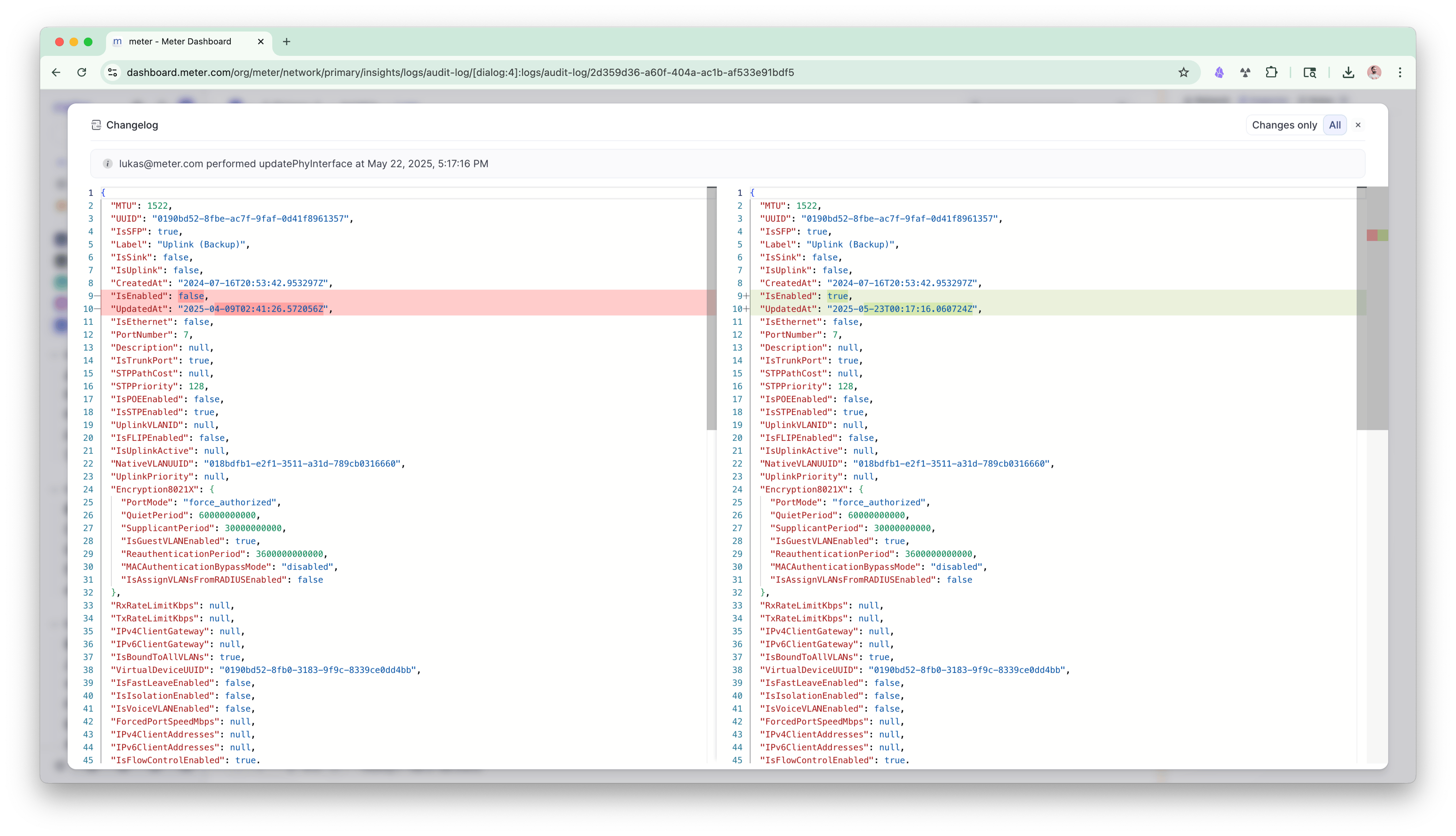 Audit logs maintain a detailed history of all changes made to your network configuration, providing transparency and accountability for administrative actions. Each log entry captures: