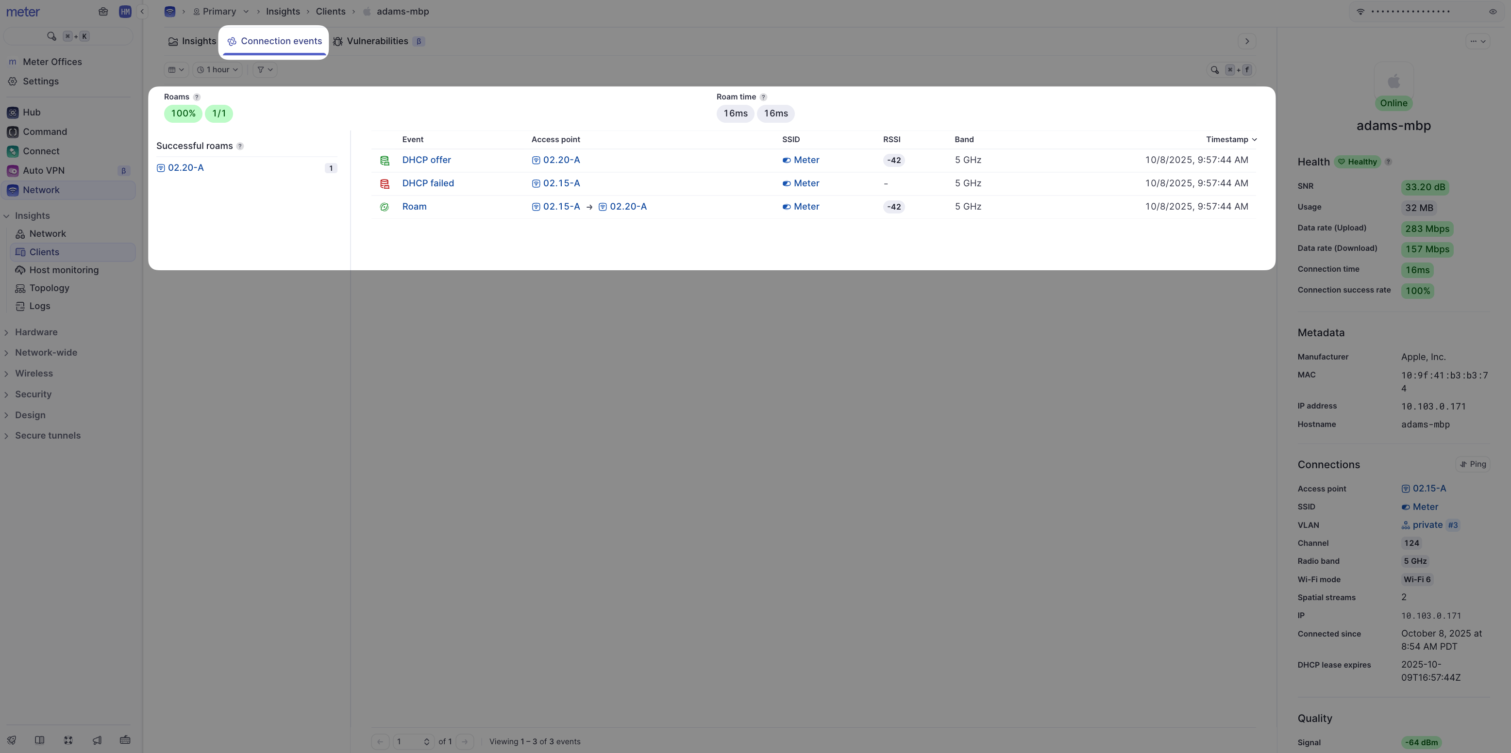 Currently, connection events will show when a client connects to, roams to/from, disassociates, or gains an IP address via DHCP.