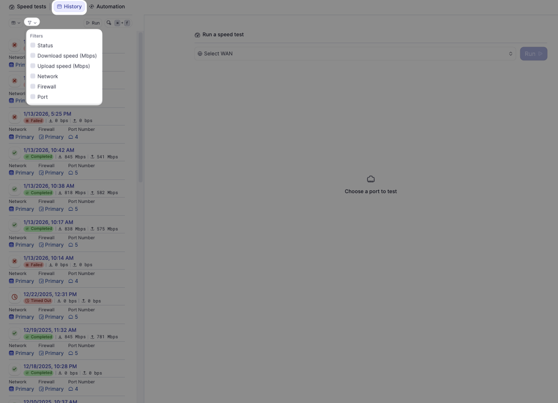 A single speed test shows performance at a point in time. Reviewing multiple results in the History view gives a clearer picture of overall WAN health.