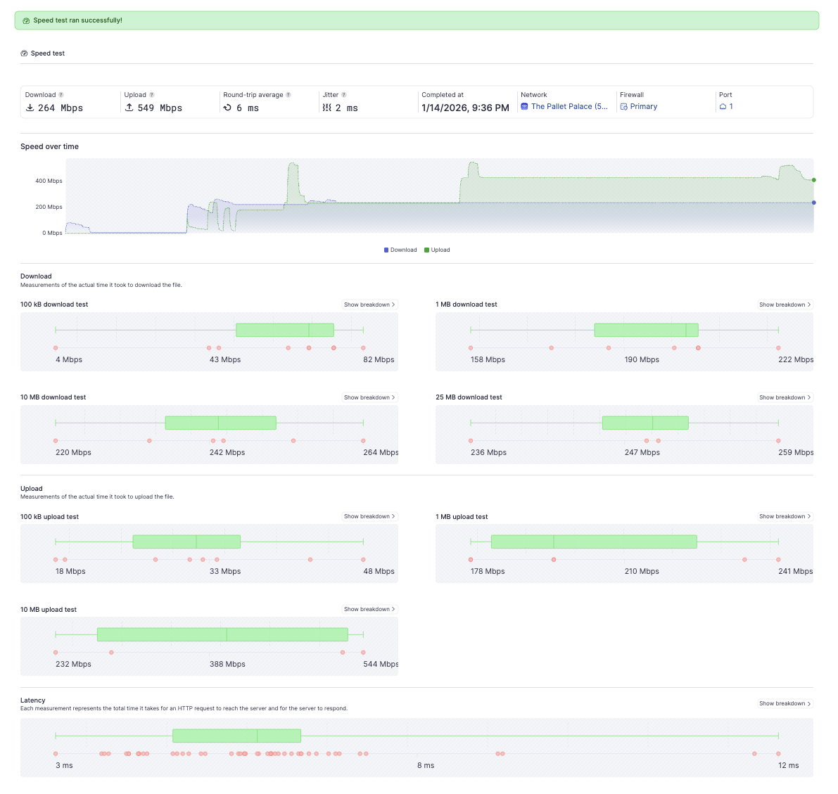 For the most accurate results, run WAN speed tests during periods of low network usage (for example, overnight or early morning). This helps reduce the impact of active user traffic on the results.