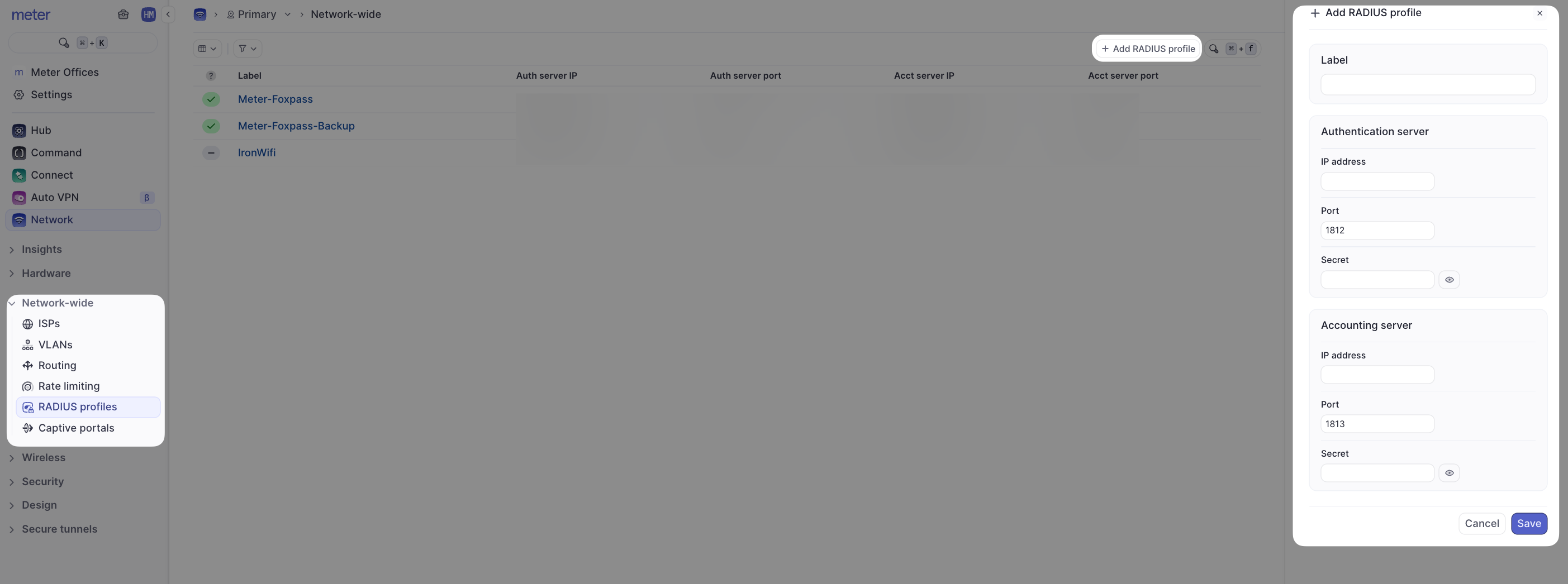 To set up 802.1X, we'll need to establish communication between your Meter Network and your RADIUS server. To do this, navigate to Network-wide > RADIUS Profiles and click on 'Add RADIUS profile' to expand the menu on the right-hand side of the screen.