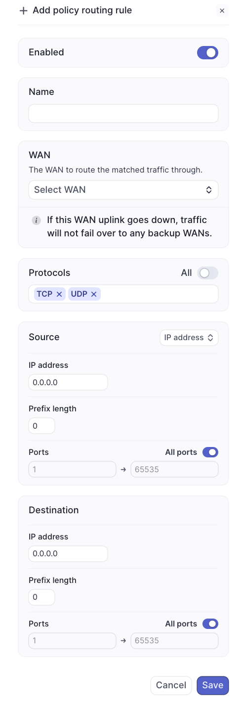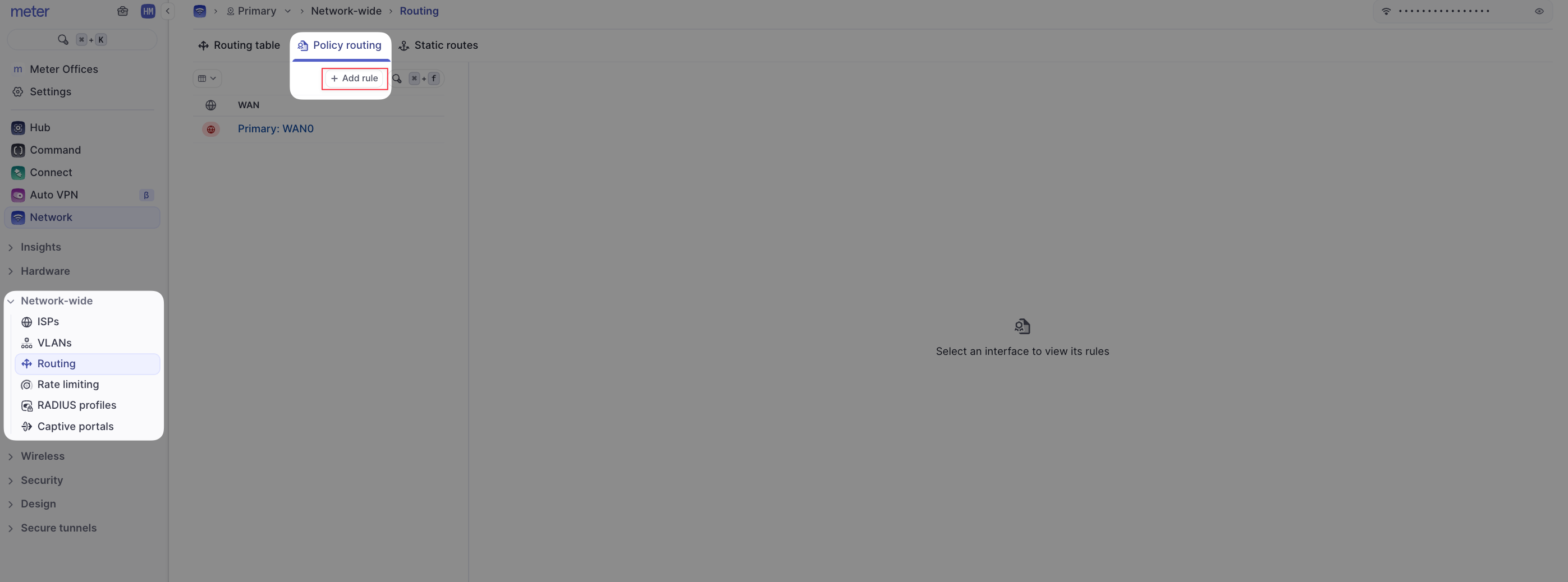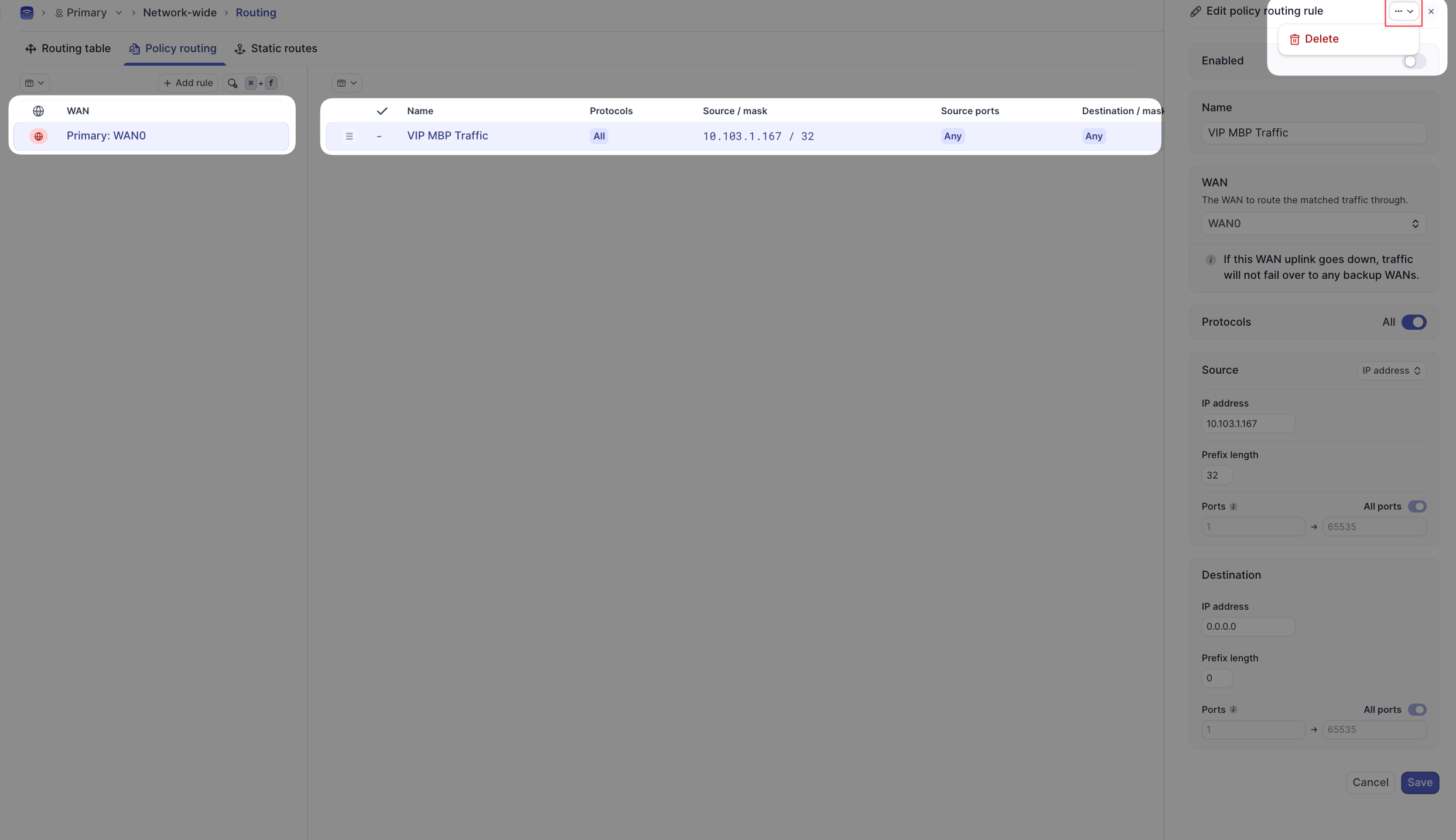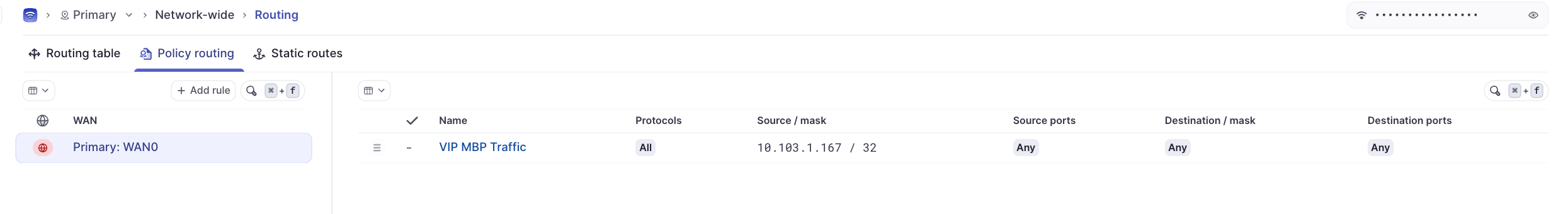 A policy-based route can be configured under Network-wide > Routing > Policy routing. Click ‘Add policy routing rule’ to create a new rule.