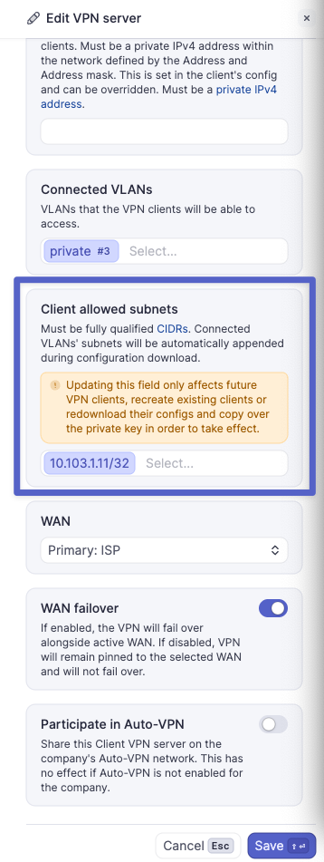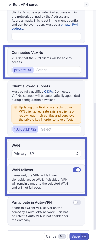 - Confirm the Client VPN server is using an active WAN. In most cases, WAN failover should also be enabled. Also, confirm the needed 'Connected VLAN' is present in the VPN server configuration.
