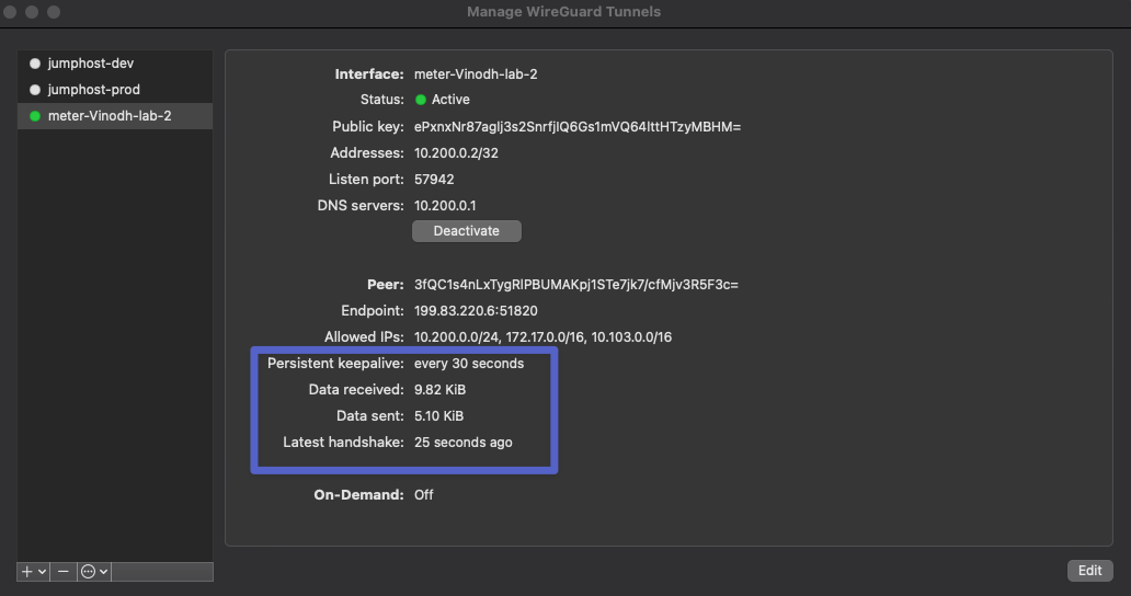 - Confirm that the Wireguard Client is connected. Click on the Wireguard symbol > Manage Tunnels, or open the Wireguard application. The connection should show both data sent and data received.