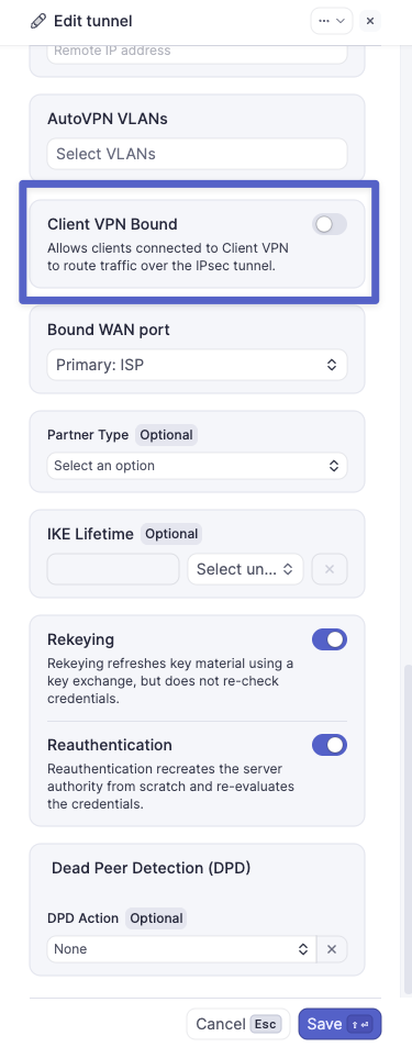 - Ensure 'Client VPN bound' is enabled on the IPsec tunnel. This adds the Client VPN server subnet as a local network.