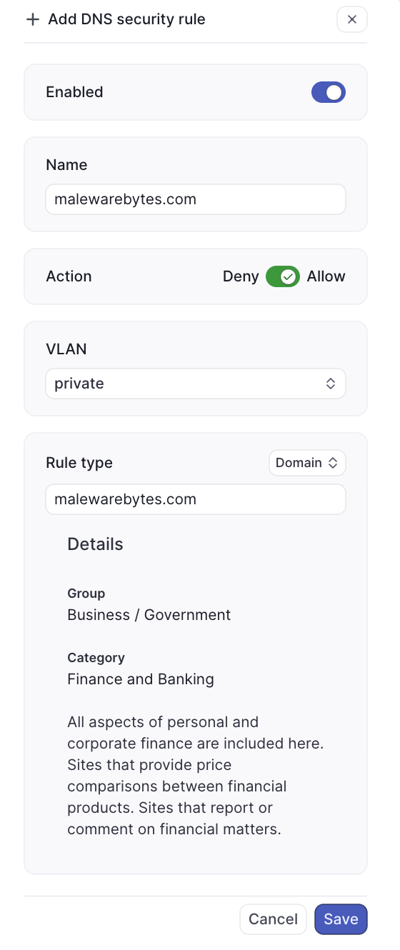 Once the rule is added, you will see the rule listed in the DNS security window.