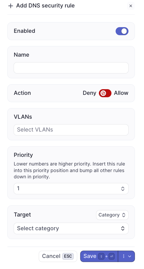 By default, DNS security does not deny anything. If you would like to add denies for your organization, rules can be created under Firewall > DNS security. Then click on ‘Add DNS security rule’.
