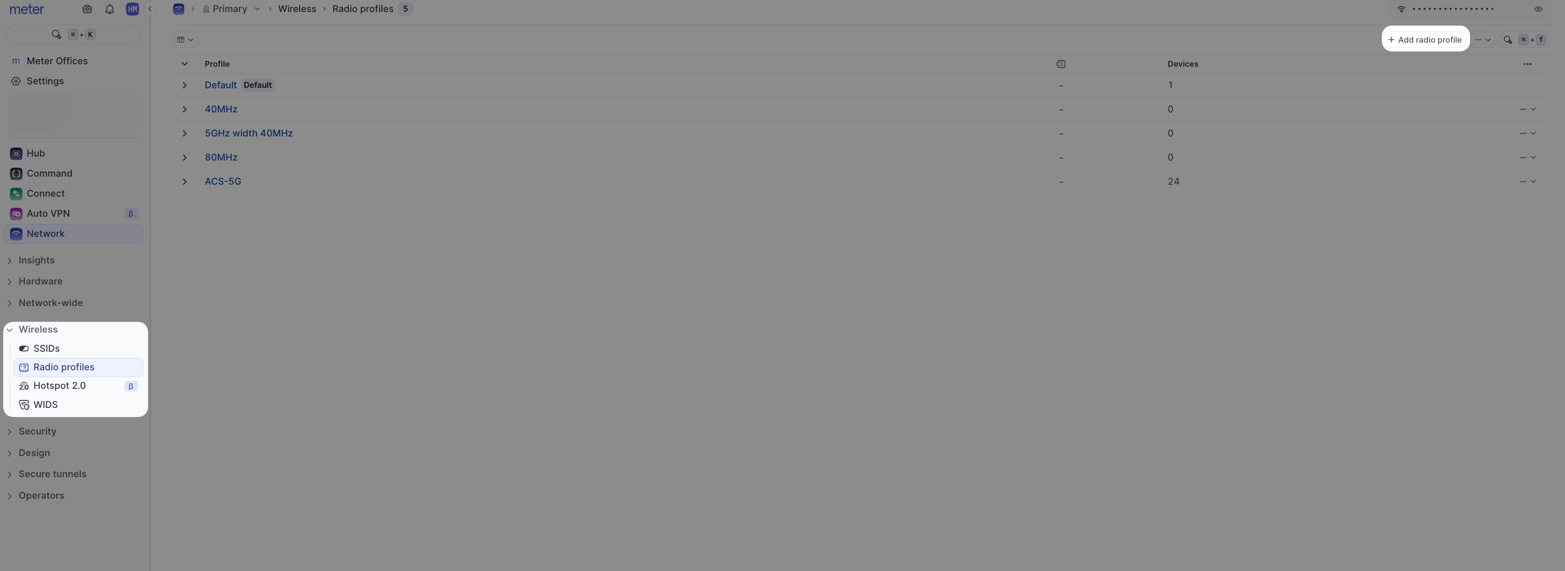 Radio profiles can be managed by logging into dashboard.meter.com and clicking on Wireless > Radio profiles.