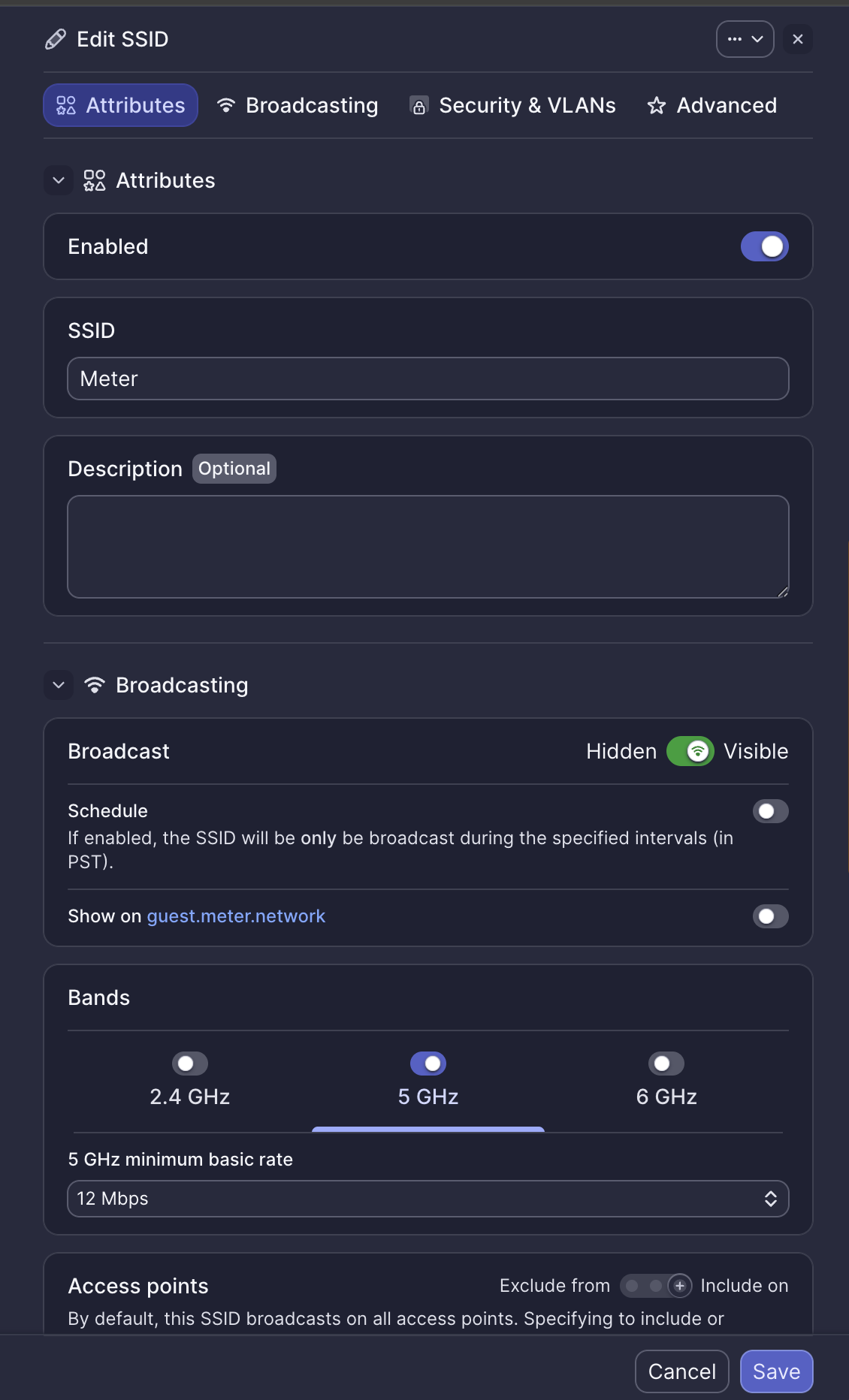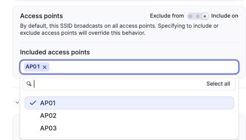 - Access Point Enablement — Broadcast on all APs or a subset (include/exclude lists).
