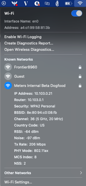 Please send a photo of your advanced Wi-Fi menu. Hold the option key and click on the Wi-Fi menu on the top-right-hand side of the screen. This menu will provide additional information like the example below: