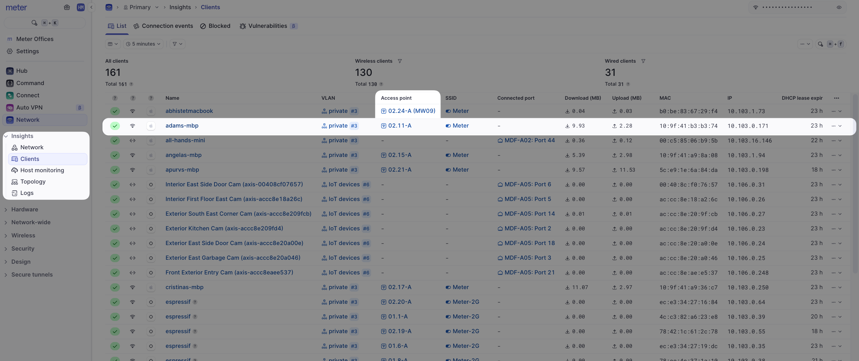 If you are in a busy environment and are noticing poor or slow Wi-Fi performance - it is a good idea to check what Access Point you are connected to. The easiest way to do this is through the Meter Dashboard (dashboard.meter.com).